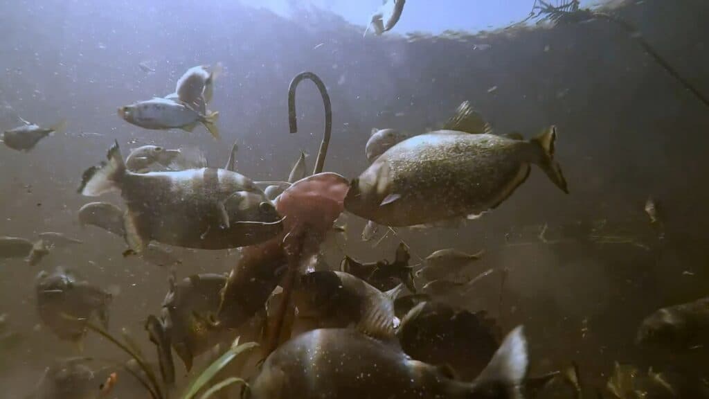 The last segment of the footage shows piranha feeding frenzy on a pintado fish that I filmed further out in the swamp where the water was more clear in a place called Touro Morto.