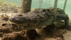 The “safest” way to approach these crocodiles is directly in front of them due to their limited visual range and at their same level or below them in the water column